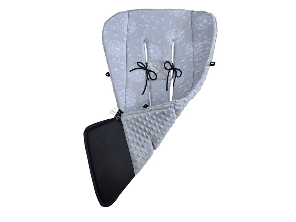 Podložka má šňůrky k fixaci podložky k ramenním pásům (zádové opěrce), aby držela a nesjížděla z kočárku.
