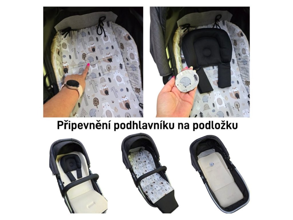 Podložka má v bocích šňůrky k fixaci podložky, aby držela a nesjížděla z kočárku. Podložky mají navíc po strannách poutka pro upevnění našich nepadacích dek.