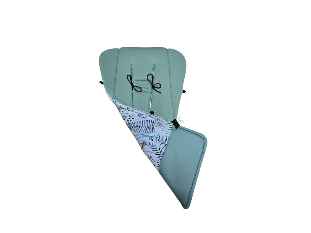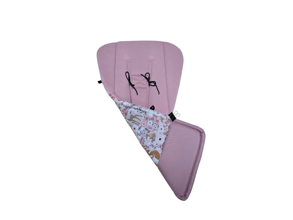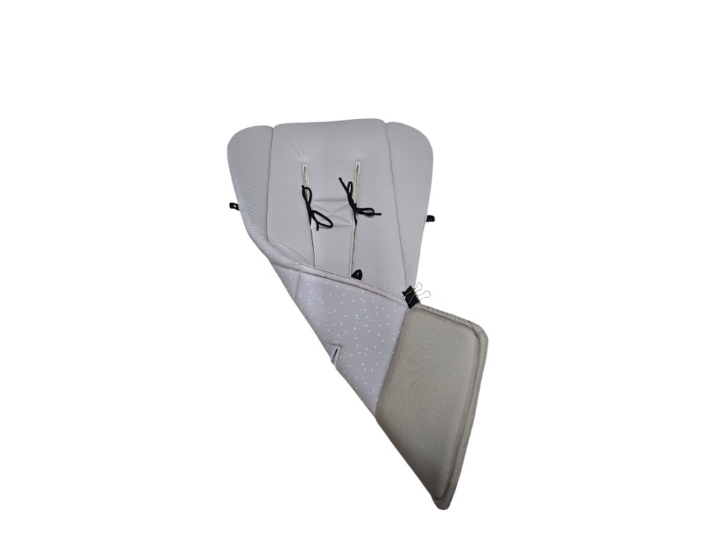 Podložka má šňůrky k fixaci podložky k ramenním pásům (zádové opěrce), aby držela a nesjížděla z kočárku.