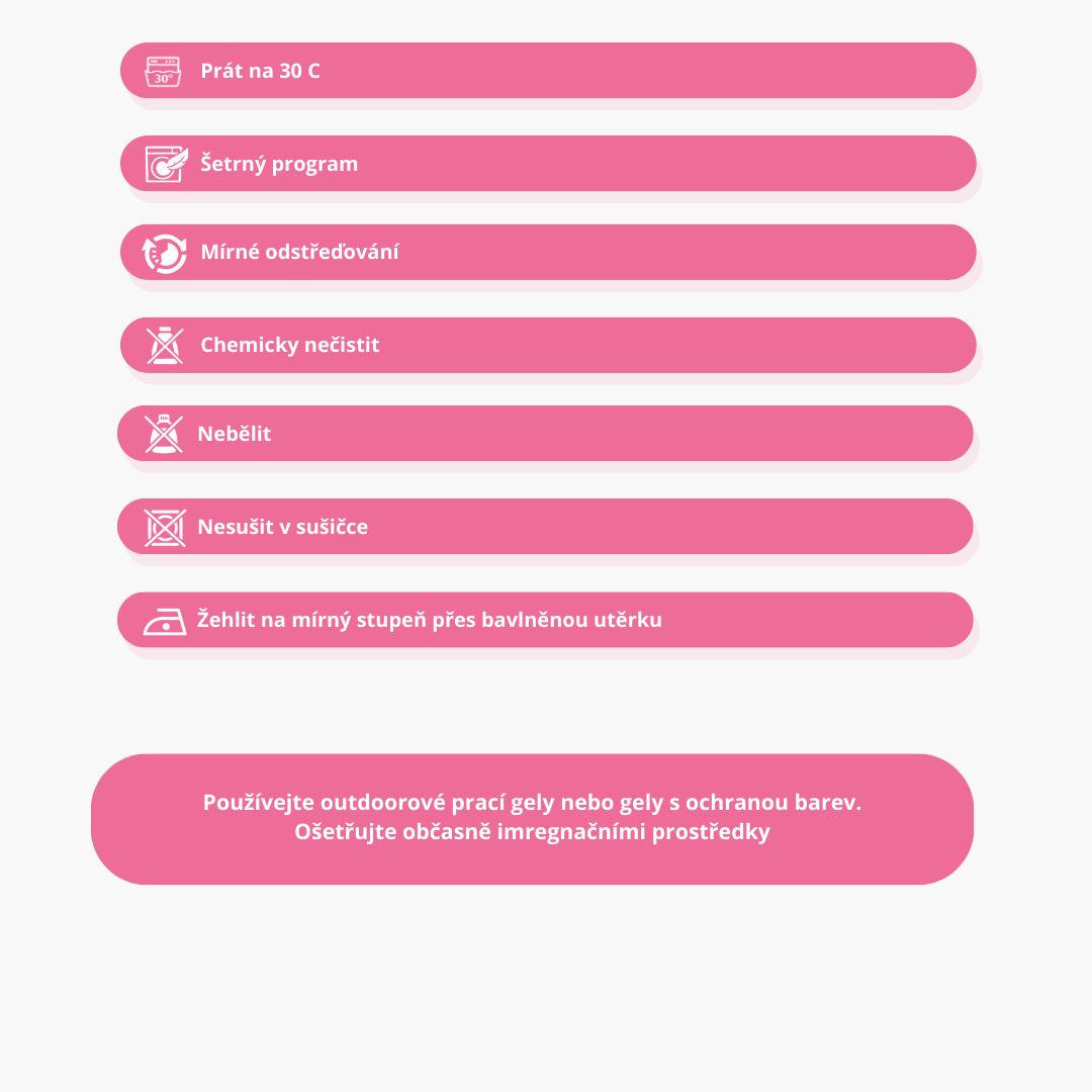 Ideální jsou prací gely na outdoorové vybavení nebo gely s ochranou barev. Doporučujeme občasné ošetření impregnačními prostředky, které usnadňují čištění a chrání před vnějšími vlivy.