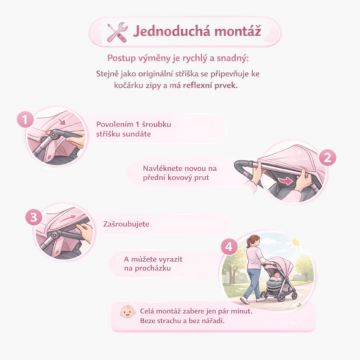 Stejně jako originální stříška se připevňuje ke kočárku zipy a má reflexní prvek.